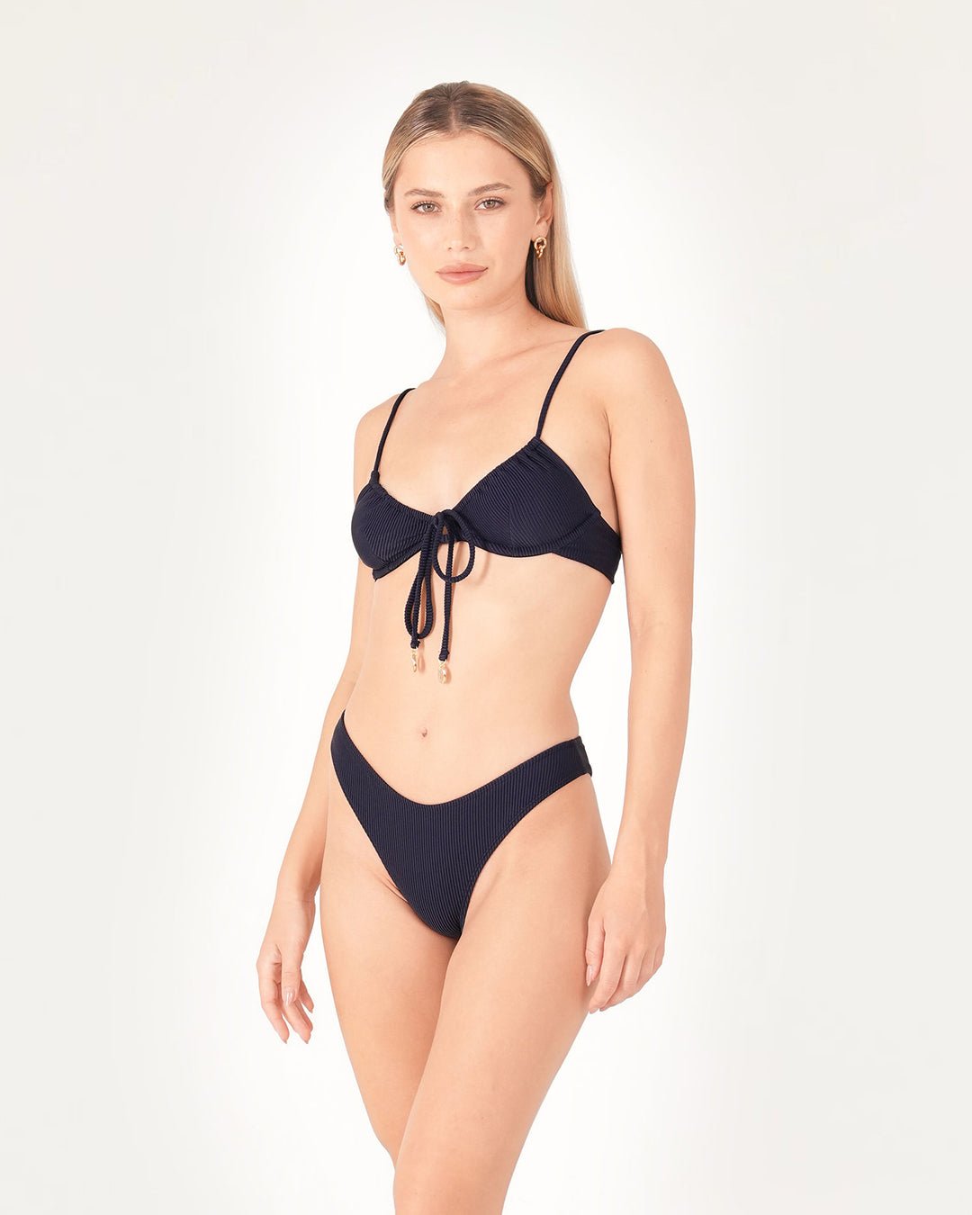 Dive into style with the Aster Bikini Top in navy. Featuring adjustable straps, ruched details, a front chest tie, and underwire support, this sleek piece blends comfort with a flattering fit—your perfect match for sunny beach days.