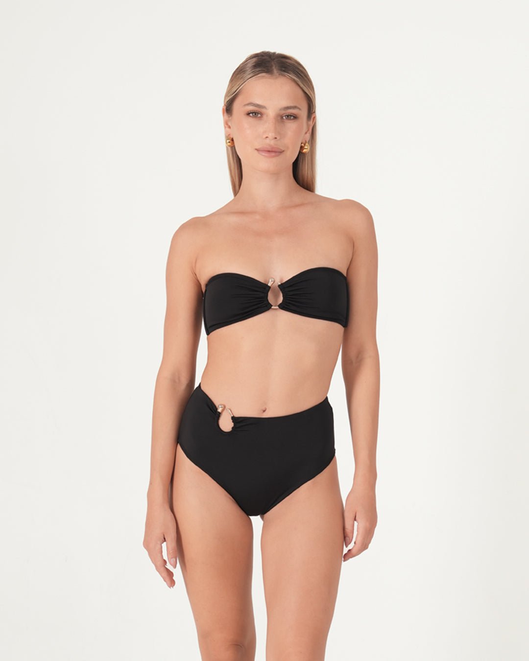 - Strapless bandeau bikini top with luxe gold hardware detail at the centre front